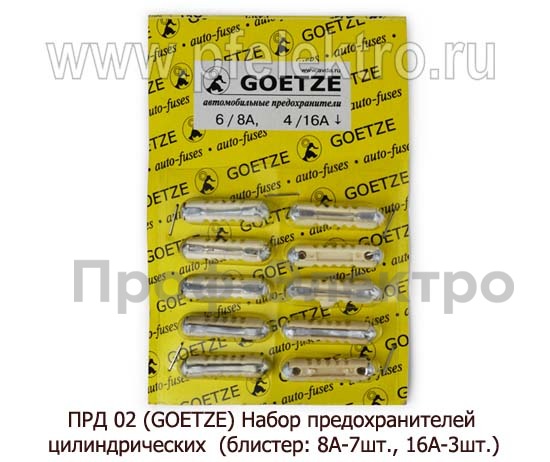 ПРД 02 (GOETZE) Набор предохранителей цилиндрических (блистер: 8А-7шт., 16А-3шт.) (GOETZE)