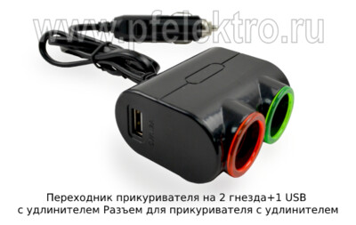 Переходник прикуривателя на 2 гнезда+1 USB c удлинителем