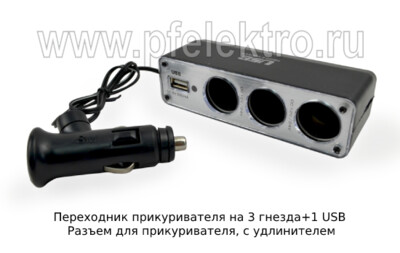 Переходник прикуривателя на 3 гнезда+1 USB