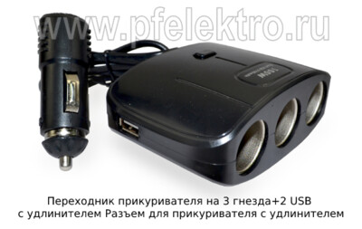 Переходник прикуривателя на 3 гнезда+2 USB c удлинителем