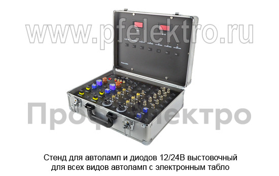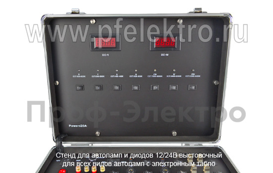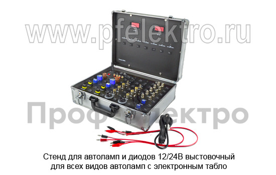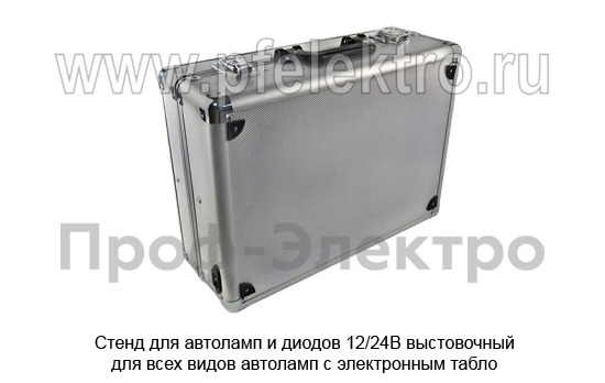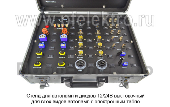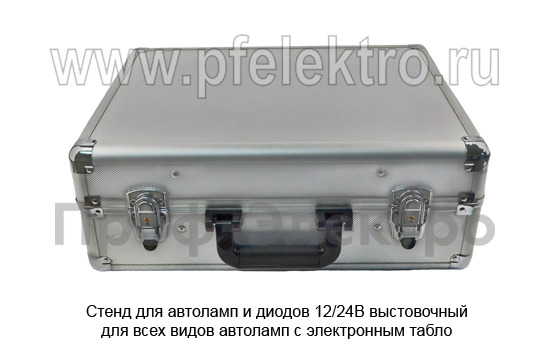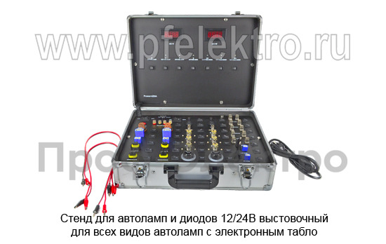 Стенд для автоламп и диодов 12/24В предназначен для демонстрации всех видов автоламп с электронным табло. Он выполнен в форме чемодана, что делает его удобным для транспортировки и использования на выставках. Подключается к 220 Вольт. В комплект входят провода с коннекторами (зажимы типа крокодил).